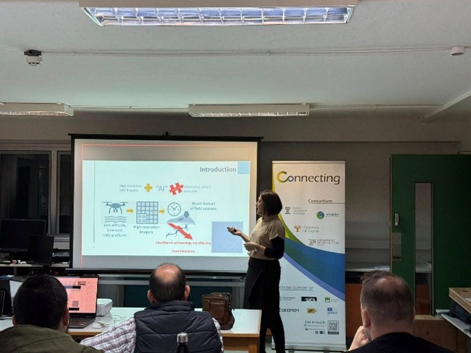 Congratulations to Dr. Argyro Argyrou, member of the CONNECTING Project, on the successful defence of her PhD dissertation, presented during an open lecture. Her doctoral research, entitled “Addressing the Accuracy Paradox in Archaeological Ceramic Surface Detection Using Low-Altitude, High-Resolution Remote Sensing Data”, makes a significant contribution to archaeological remote sensing and computational archaeology by integrating UAV-based high-resolution and multispectral imagery with advanced machine learning techniques. By addressing the accuracy paradox in imbalanced archaeological datasets through boosting algorithms (AdaBoost, XGBoost), decision-threshold optimisation, and tailored evaluation metrics, her work substantially improves the detection of ceramic surface remains, enhancing both accuracy and survey efficiency. Grounded in extensive empirical research across three Mediterranean case studies (Alampra and Kofinou in Cyprus, and Megara in Greece), the dissertation demonstrates strong real-world archaeological impact and introduces a novel metric, Sensitivity Archaeological Detection (SAD), offering a robust framework for future research in cultural heritage and remote sensing. We warmly congratulate Dr. Argyrou on this outstanding achievement and wish her every success in her future academic and professional journey.
